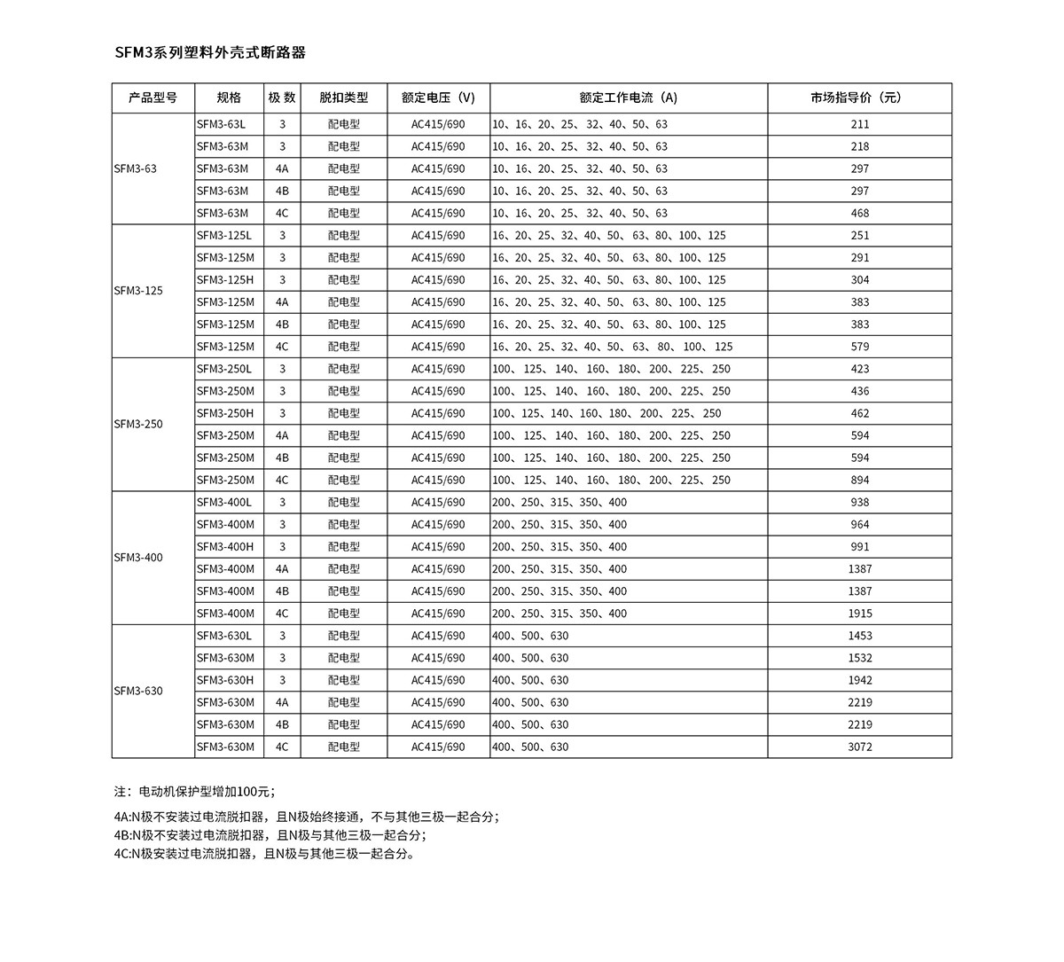 SFM3系列塑料外殼式斷路器(以下簡稱斷路器),適用于交流50/60Hz,其額定絕緣電壓至1000V,額定工作電壓415/690V,額定工作電流至8OOA的電路中作不頻繁轉(zhuǎn)換及電動機(jī)不頻繁起動之用(Inm≤40OA及以下)。斷路器具有過載、短路保護(hù)功能,能保護(hù)線路和電源設(shè)備不受損壞。具有體積小、分?jǐn)嗄芰Ω摺w弧短、抗振動等特點。可垂直安裝(即豎裝)也可以水平安裝。