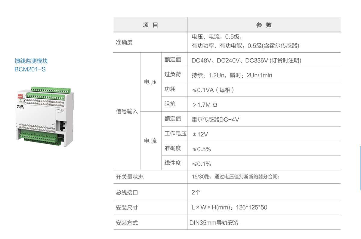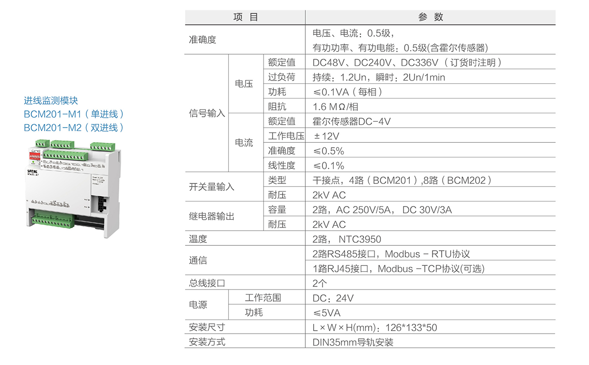 BCM201系列為直流測(cè)量。BCM系列精密配電監(jiān)測(cè)單元用于監(jiān)測(cè)數(shù)據(jù)中心交直流列頭柜的電力運(yùn)行參數(shù),測(cè)量進(jìn)線和饋線支路的電壓、電流、電能、諧波等電參量,及所有斷路器開(kāi)關(guān)狀態(tài),具有跳閘報(bào)警功能。各輸出回路具有兩級(jí)用戶可設(shè)置的過(guò)流報(bào)警,預(yù)防潛在的電源故障。產(chǎn)品配置7寸彩色液晶觸摸屏,并提供以太網(wǎng)通信接口,方便接入其他系統(tǒng)。