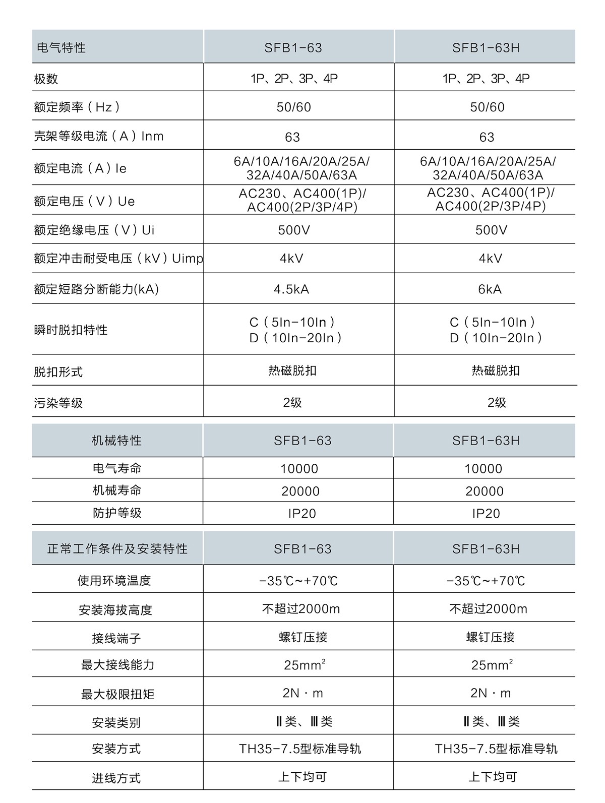 SFB1-63系列小型斷路器適用于交流50Hz或60Hz,順定電壓為400V及以下,顏定電流6A-63A的場(chǎng)所。主要用于辦公樓、住宅和類似的建筑物的照明、配電線路及設(shè)備的過(guò)贏、短路保護(hù),也可在正常情況下,作為線路不頻繁轉(zhuǎn)換之用。