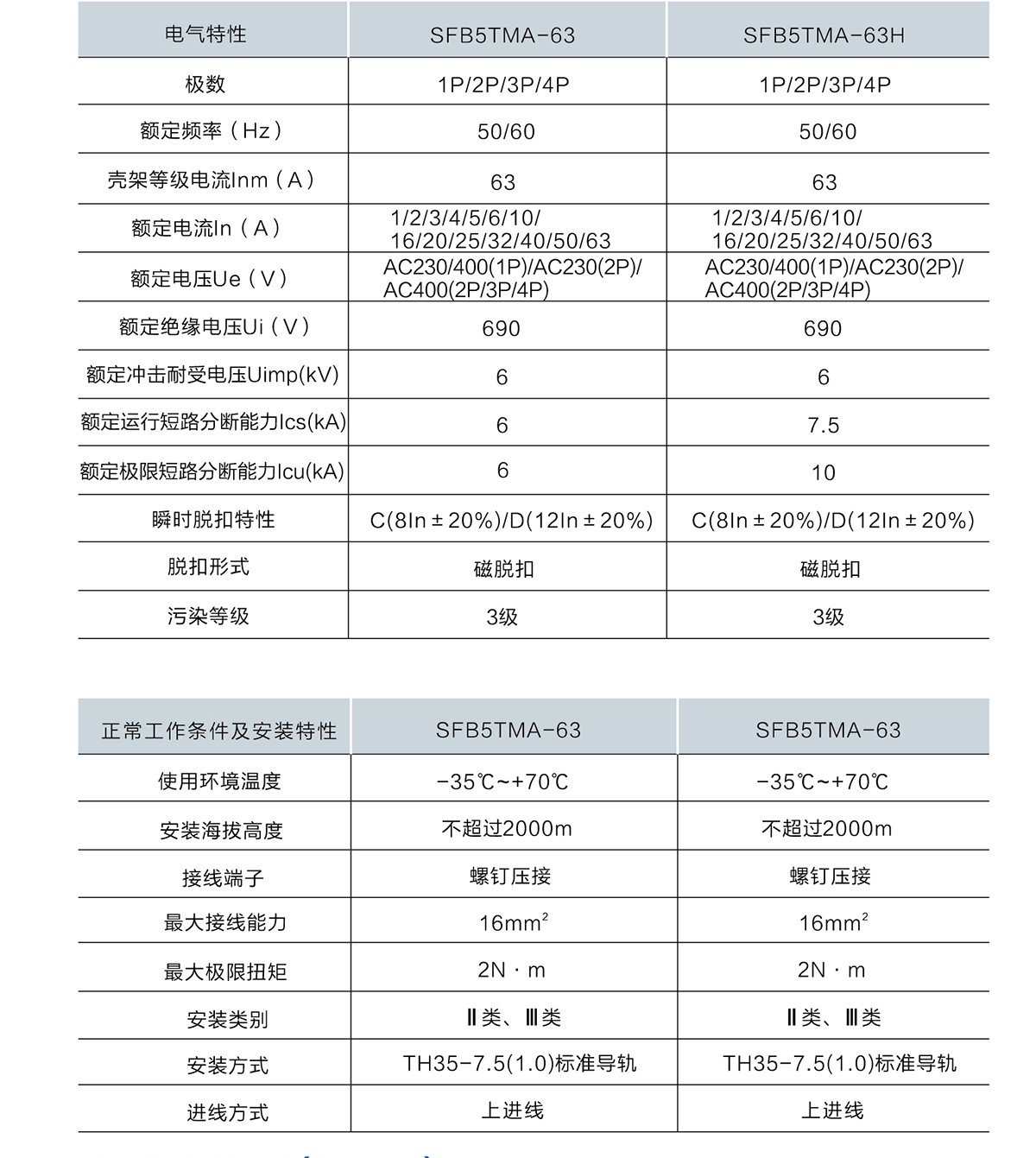 SFB5TMA-63單磁式斷路器〈以下簡稱斷路器〕主要適用于交流50Hz/60Hz,顏定電流1A至63A。憫定電壓230V或40V的配電網絡中。適用于醫療IT配電系統、電機保護及建筑消防系統等領域的低壓終端配電,作為短路保護開關,也可與熱繼電器或電機啟動器配合使用,實現過載保護。