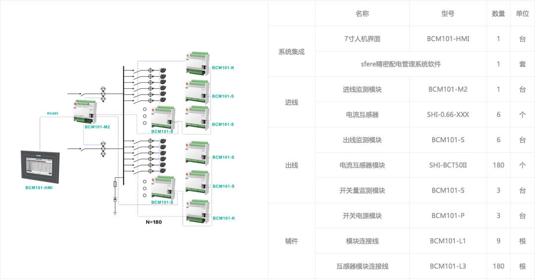 進線回路采用BCM101-M2模塊,監測兩路三相進線回路,出線回路配置6個BCM101-S模塊(最大可監測180個出線回路)及3個BCM101-K開關量監測模塊。實現對進線及出線各回路電參量基本電量數據、電能數據、電網質量、諧波數據、需量數據、極值數據、開關狀態監測及越限告警等功能。