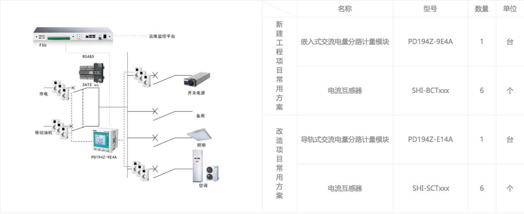 基站內的開關電源、空調、照明以及插座都由交流配電箱進行供電,并通過多回路交流表計實現高精度分路測量,而基站內各類通信設備主要是由直流系統進行供電,利用直流電量分路計量設備對不同運營商的通信設備實現能耗監測,最終都通過FSU設備接至運維監控平臺,實現對通信基站能耗的有效監測及運營管理。