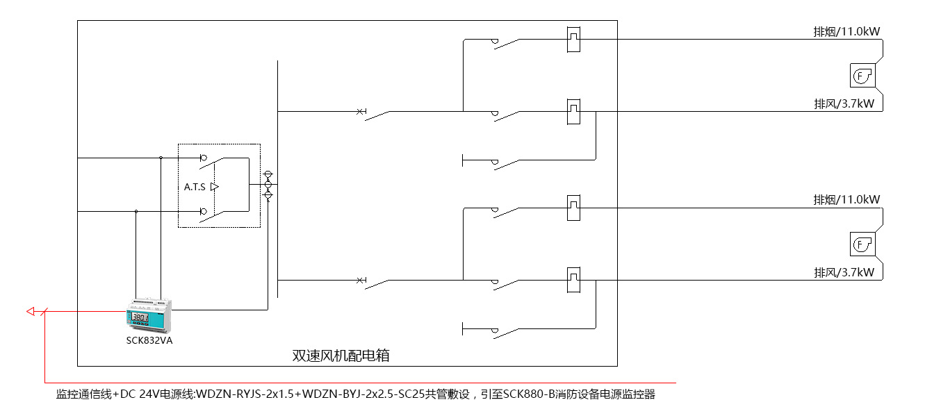 排煙風機、排風風機屬于重要的消防設備,需對這些消防設備的電源及工作狀態進行了全面的監測。推薦電源進線處安裝一臺SCK832VA+JK電壓/電流信號傳感器,監測雙電源轉換開關前端兩路電壓及后端一路電流。